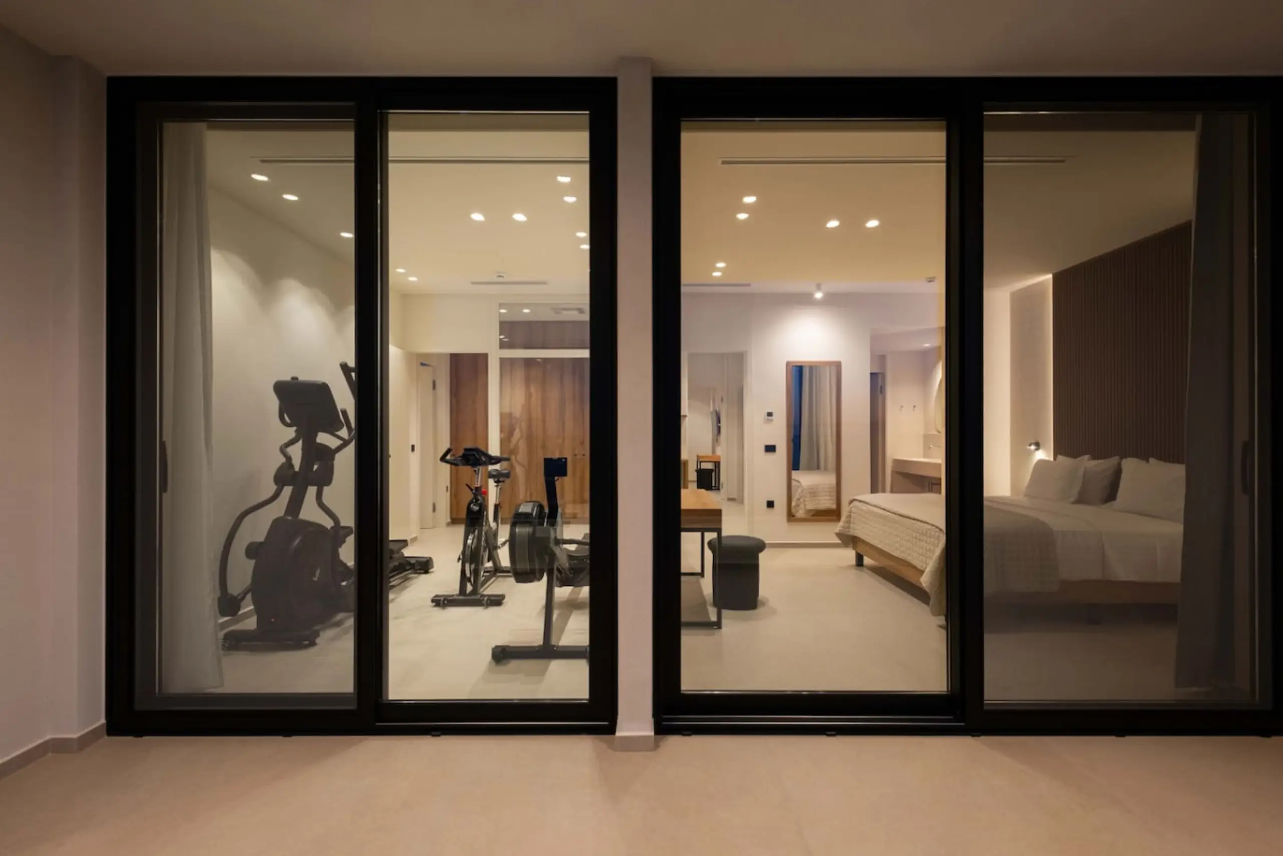 The villa features 4 en-suite bedrooms—one on the ground floor and three upstairs—along with a small fitness area. All bedrooms have balcony access, and two offer uninterrupted sea views.